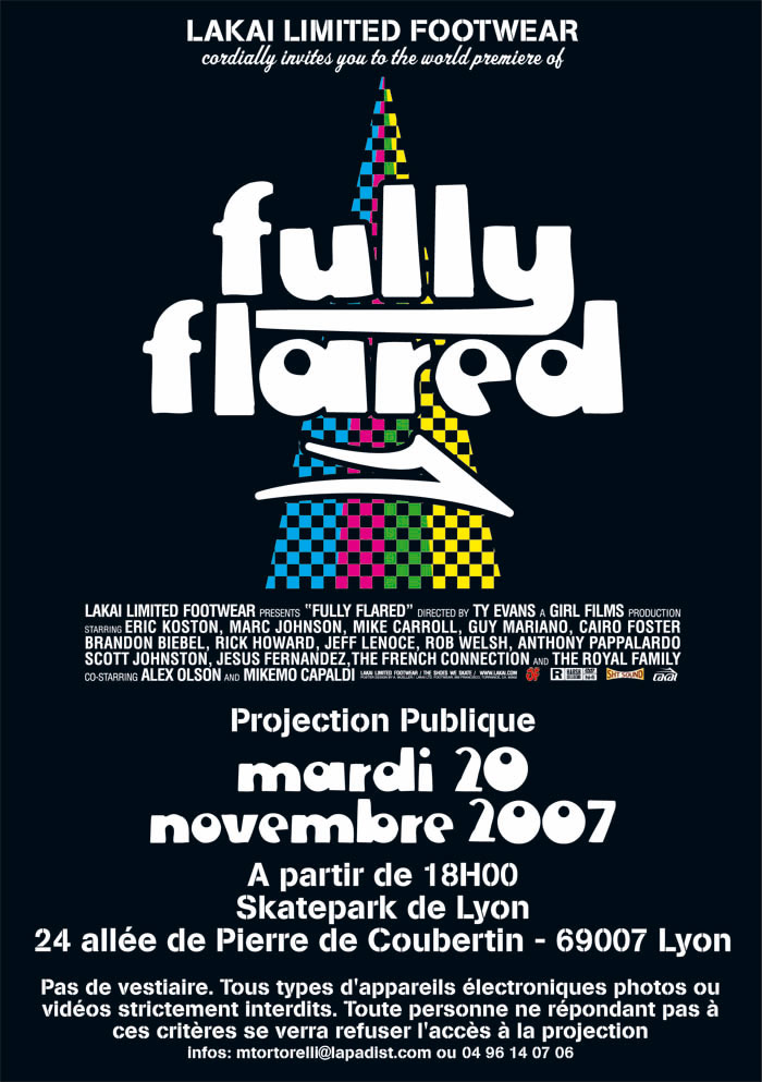 flyer DVD Fully Flared #2 Une projection Public du DVD Fully Flared #2 avec LAKAI SKATESHOES est organisé le mardi 20 novembre 2007 au skatepark de Lyon à partir de 18h00. Venez nombreux !