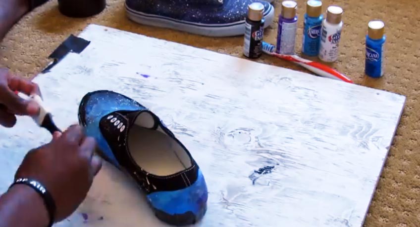 A l’aide de la brosse à dents ou d’une petite brosse, appliquer les étoiles en mouchetant la chaussure avec de la peinture blanche pour créer des formes projetés et irrégulières. Laissez sécher une bonne demi-journée.